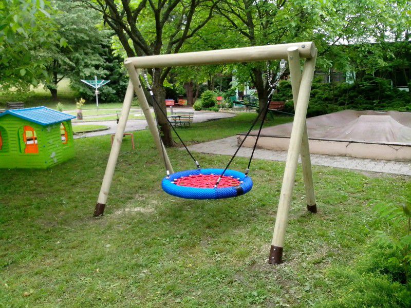 Popis zařízení: Dřevěné části konstrukce jsou provedeny ze smrkové mimostředné kulatiny bez prasklin o 100 a 120 mm. Veškeré použité dřevo je tlakově impregnováno Wolmanitem CX 10 a zabroušeno do hladka. Všechen spojovací materiál je zinkován. Hnízdo má průměr 1000 mm a je tvořeno pevnou kruhovou částí, která je opletena lanem a výplet tvoří lanová síť. Hnízdo je certifikováno výrobcem dle EN 1176:2009. Lano a síť je zhotoveno z materiálu, který je nenasákavý, odolává plísním, bakteriím povětrnostním vlivům a většině chemikálií. Pro zavěšení hnízda jsou použity komponenty a závěsy dodávané výrobcem Veškeré spoje jsou kryty plastovými záslepkami. Nosné sloupy jsou osazeny v kovových patkách. Patky jsou opatřeny povrchovou úpravou epoxidovou práškovou barvou – Komaxit.