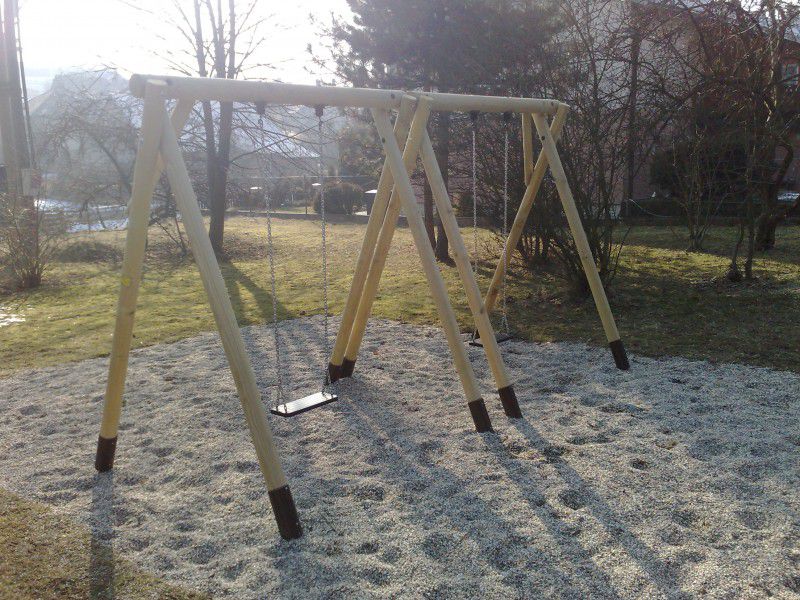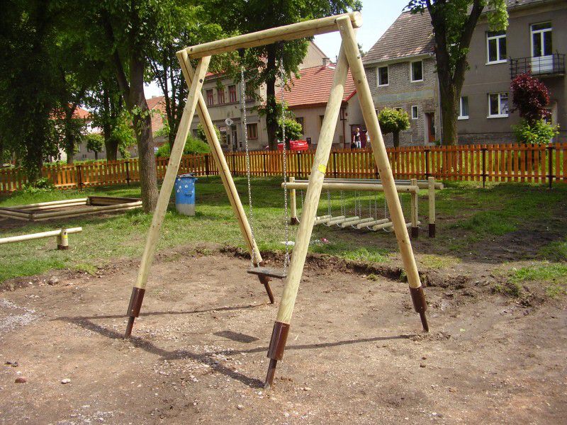 Popis zařízení: Dřevěné části konstrukce jsou provedeny ze smrkové mimostředné kulatiny bez prasklin o 100 mm. Veškeré použité dřevo je tlakově impregnováno Wolmanitem CX 10 a zabroušeno do hladka. Závěsy s dvojnásobným jištěním a pevnostním ložiskem jsou kovové. Povrchová úprava je provedena základní barvou na kov a černou barvou do exteriéru. Řetězové závěsy jsou z nerezi a sedátko na houpačku je z odolné pryže se zalisovaným hliníkovým profilem. Řetězy i sedátko je certifikované dle ČSN EN 1176:2009:2018. Všechen spojovací materiál je zinkován. Veškeré spoje jsou kryty plastovými záslepkami. Nosné i boční nosné sloupky jsou osazeny v kovových patkách, které jsou opatřeny povrchovou úpravou epoxidovou práškovou barvou – Komaxit.
