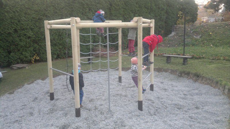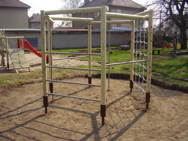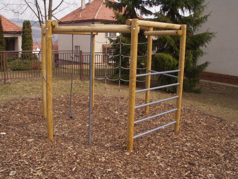 Popis zařízení: Dřevěné části konstrukce jsou provedeny ze smrkové mimostředné kulatiny bez prasklin o 100 mm. Veškeré použité dřevo je tlakově impregnováno Wolmanitem CX 10 a zabroušeno do hladka. Vodorovné stupy žebříku, hrazdy a šplhací tyč jsou vyrobeny z pozinkované trubky, s dodatečným antikorozním nátěrem v barvě šedé. Síť je vyrobena na míru z nerezového řetězu. Šplhací lano je z polypropylénu o 18 mm. Všechen spojovací materiál je zinkován. Veškeré spoje jsou kryty plastovými záslepkami. Nosné sloupy jsou osazeny v kovových patkách. Patky jsou opatřeny povrchovou úpravou epoxidovou práškovou barvou – Komaxit.