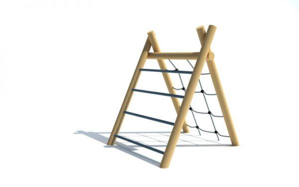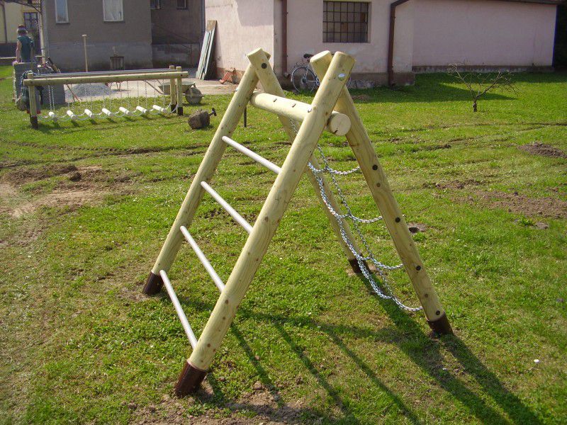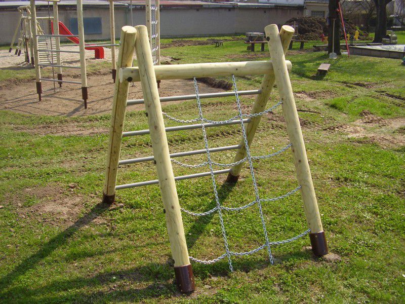 Popis zařízení: Dřevěné části konstrukce jsou provedeny ze smrkové mimostředné kulatiny bez prasklin o 100 mm. Vše je tlakově impregnováno Wolmanitem CX 10 a zabroušeno do hladka. Sítě jsou vyrobeny na míru z nerezového řetězu. Vodorovné stupy žebříku jsou vyrobeny z pozinkované trubky s dodatečným antikorozním nátěrem v barvě šedé. Všechen spojovací materiál je zinkován. Veškeré spoje jsou kryty plastovými záslepkami. Nosné sloupky jsou osazeny v kovových patkách, které jsou opatřeny povrchovou úpravou epoxidovou práškovou barvou – Komaxit.