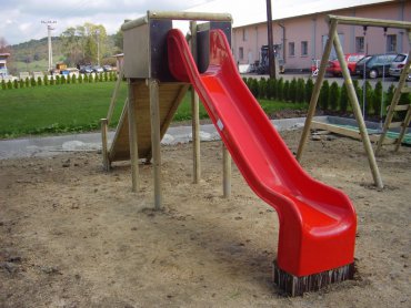 Popis zařízení: Dřevěné části konstrukce jsou provedeny ze smrkové mimostředné kulatiny bez prasklin o 100, o 90 mm a půlkůlů 100/50 mm. Veškeré použité dřevo je tlakově impregnováno Wolmanitem CX 10 a zabroušeno do hladka. Podesta, bariéry a příruba skluzavky jsou provedeny z bukové vodovzdorné překližky tl. 21 a 18 mm. Okraje překližky jsou zabroušeny a zatřeny barvou do exteriéru. Všechen spojovací materiál je zinkován. Skluzavka je laminátová s certifikátem dle ČSN EN 1176:2018. Veškeré spoje jsou kryty plastovými záslepkami. Nosné i boční nosné sloupky jsou osazeny v kovových patkách, které jsou opatřeny povrchovou úpravou epoxidovou práškovou barvou – Komaxit.